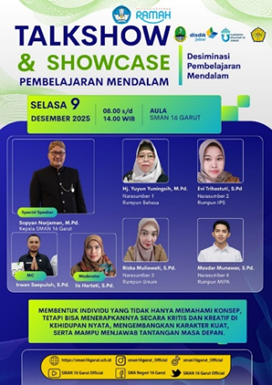 Sebagai tindak lanjut dari kegiatan pelatihan tersebut, perlu dilakukannya sosialisasi atau diseminasi kepada para guru, termasuk guru di sekolah lain sehingga sekolah dan guru sasaran dapat memperoleh manfaat dari pelatihan tersebut. Selain itu untuk meningkatkan kompetensi dan pemahaman para guru dalam mengimplementasikan pembelajaran mendalam. Untuk melakukan proses sosialisasi tersebut dilaksanakanlan kegiatan Talkshow dan Showcase, pada hari Selasa, 9 Desember 2025 yang diikuti oleh semua guru di SMAN 16 Garut. Kegiatan Talkshow dan Showcase ini menghadirkan narasumber dari bapak ibu guru hebat sebagai perwakilan dari rumpun bahasa, rumpun IPS, rumpun MIPA dan rumpun Umum.